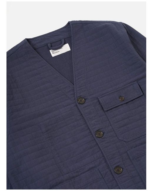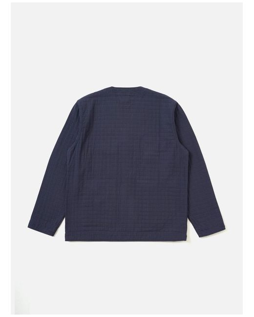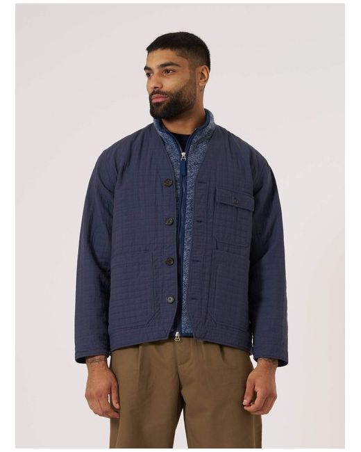Navy Rahim Cotton Cabin Jacket A collarless, cardigan style jacket with two lower patch pockets, one smaller button flap pocket and an inside pocket. Our model is 6' 1" with a 39' Chest and is wearing a size ‘Large.’.