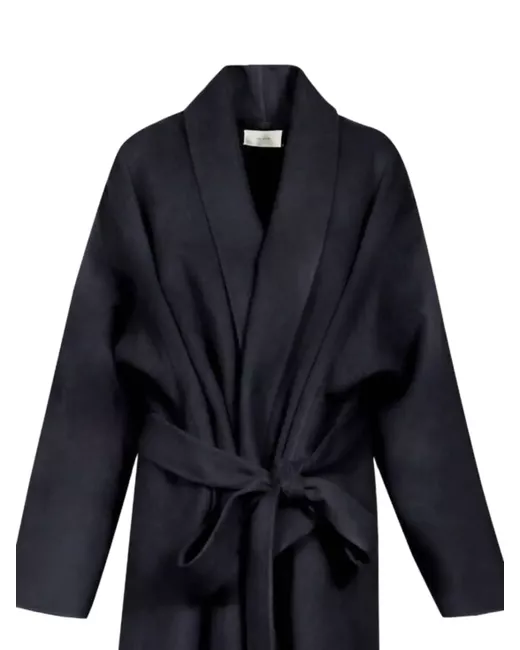 navy blue tie fastening long sleeves shawl lapels belt