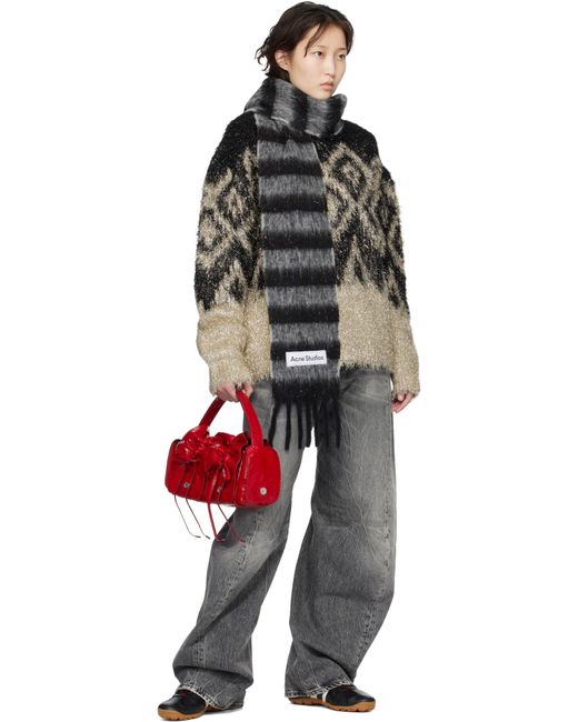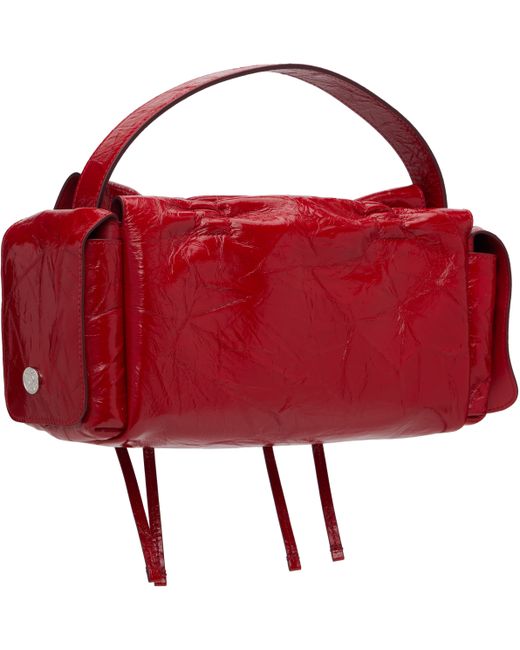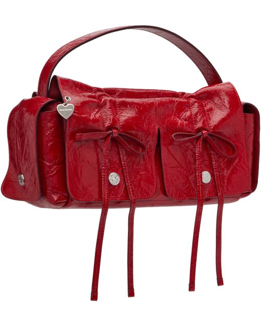 Crinkled patent goatskin top handle bag. · Certified LWG · Adjustable and detachable shoulder strap · Ruching and bow appliqués at face · Magnetic flap pocket at sides · Magnetic flap · Patch pocket at interior · Buffed lambskin lining · Logo-engraved silver-tone hardware · H5.5 x W13.5 x D4 Supplier color: Red