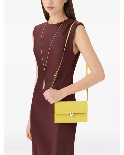 light yellow leather Sfera closure adjustable shoulder strap card slots zip pocket lining