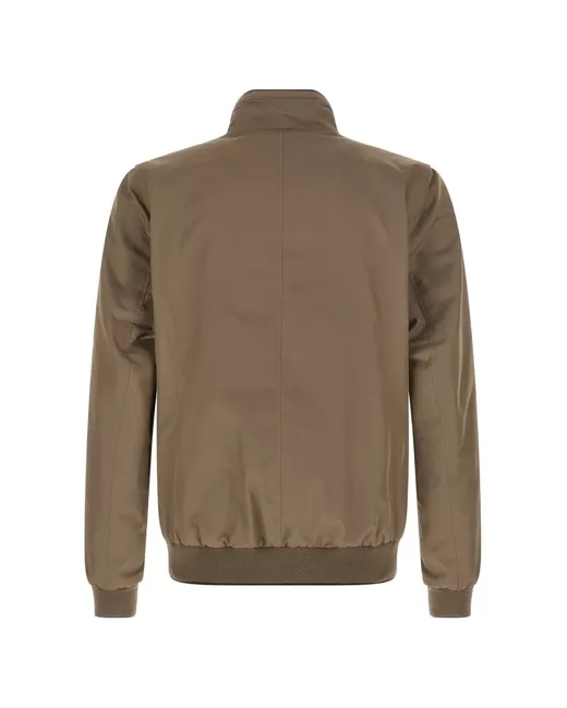 brown standing collar front zip closure zip pockets long sleeves cuffed sleeves
