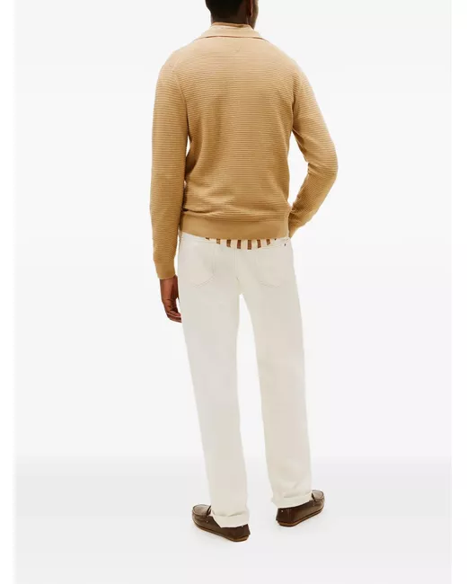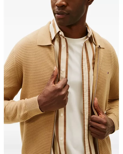 beige ribbed texture point collar zip fastening long sleeves logo detail