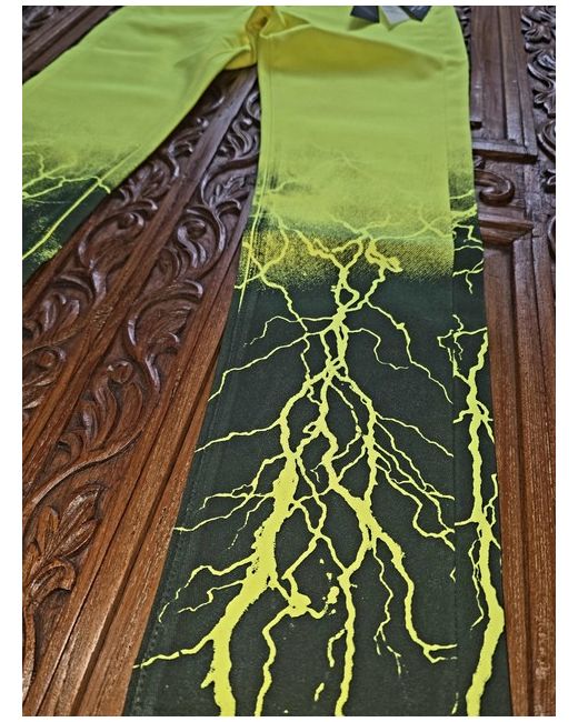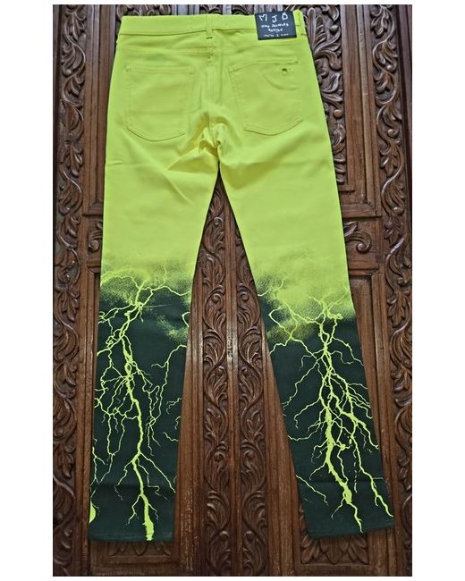 MJB Marc Jacques Burton Lightning Crixus jeans in neon yellow and black. The denim features a striking screen-printed lightning bolt design, a signature of the brand's style inspired by the London punk scene. Product Details Brand: MJB - Marc Jacques Burton Design: Neon yellow wash with a lightning bolt print that is screen-printed by hand to create a cracked effect. Fit: They are described as slim-fit, skinny, or straight-leg stretch-denim jeans. Origin: Made in Italy from a cotton blend.