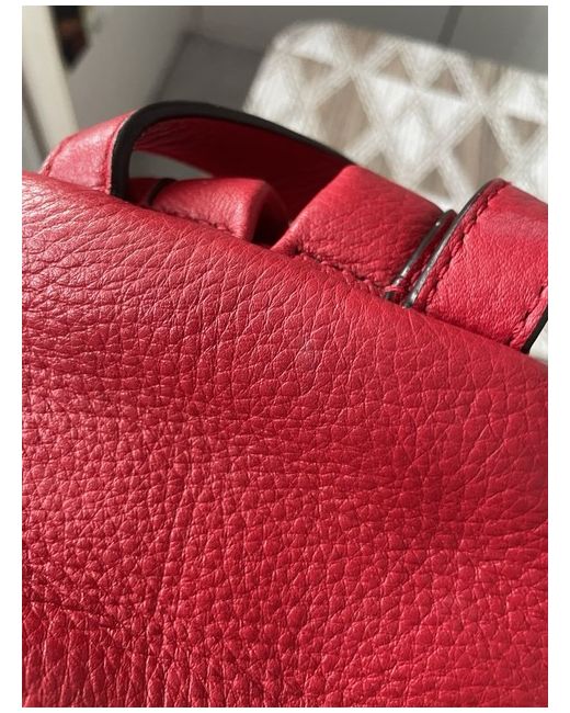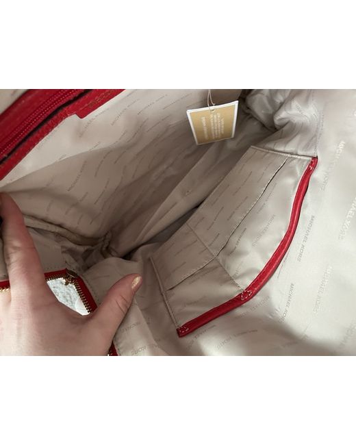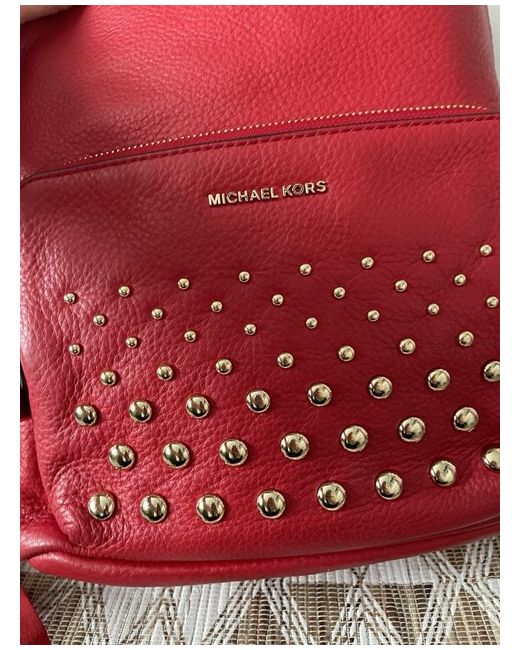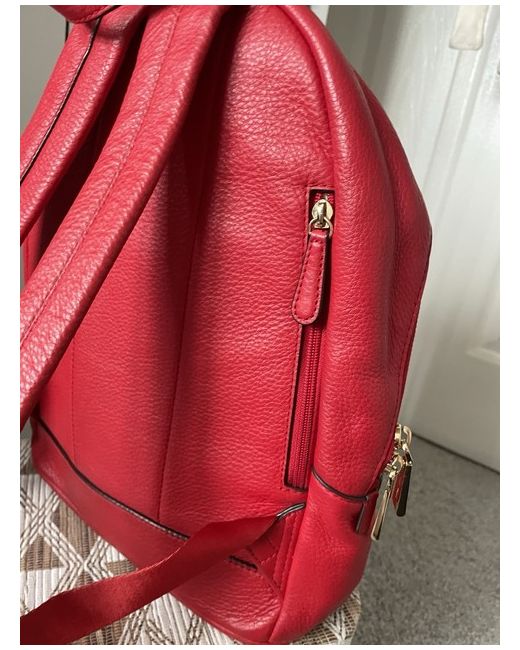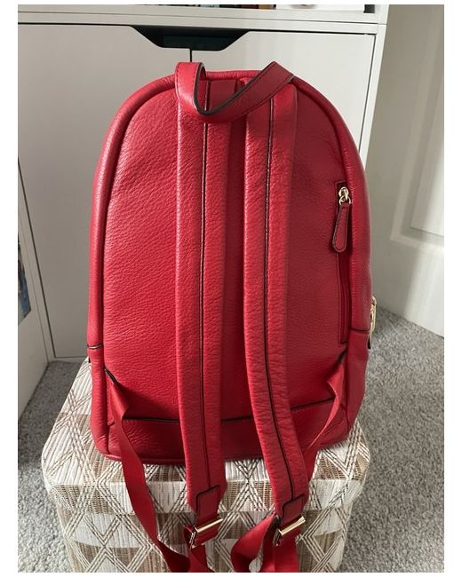 The Michael Kors Bright Red Leather Gold Hardware Backpack is a stylish and practical accessory for women. Made from high-quality leather with gold hardware accents, this medium-sized backpack features a zip closure and adjustable straps for added convenience. The bright red exterior colour adds a pop of colour to any outfit, making it perfect for travel or casual occasions. The beige lining colour and studded accents add a touch of sophistication to this designer backpack, which is sure to make a statement.