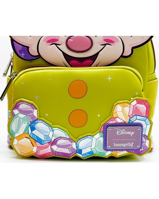Cloisonne Disney x Loungefly Label. Dopey Cosplay Face Applique. Inspired by the Film Snow White and the Seven Dwarfs / Dwarves. Blue Lenticular Style Diamond Appliques. Exterior Front Pocket.