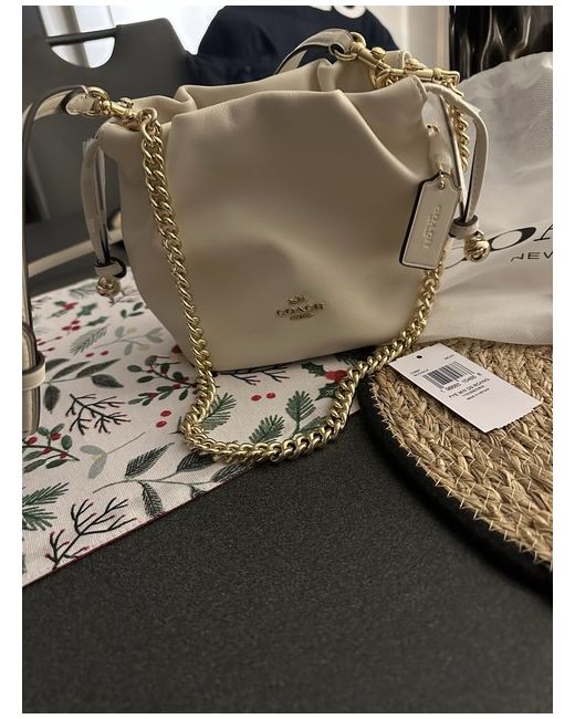 The Coach Faye drawstring bag is a small, cream-coloured leather crossbody bag designed for casual or formal occasions or can be used as a hand held bag with two strap options. It features a drawstring closure, leather handle/strap, and is branded with Coach. This designer piece is perfect for women looking for a stylish and practical handbag option. I wanted gift, not been used. still has wrapper on drawstrings.