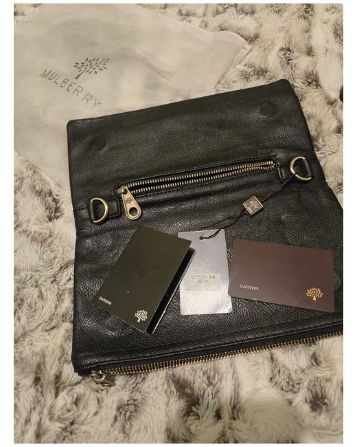 Leather: Genuine Black Darwin Leather – a premium, durable vegetable-tanned leather. Features the iconic gold-tone Mulberry tree plaque on the front. Includes original Mulberry dust bag. Can be worn as an elegant clutch or as a crossbody/shoulder bag using the adjustable, detachable strap included.
