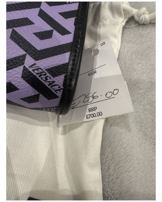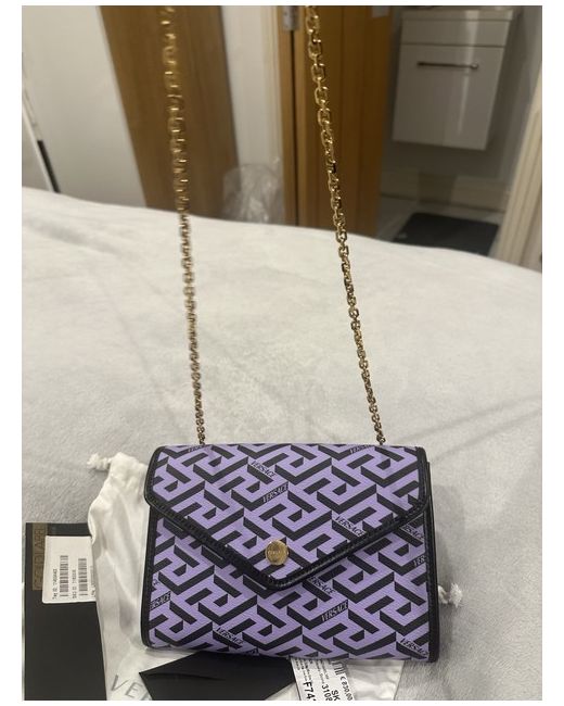 This Versace bag is a rectangular clutch made from lilac leather with a zip closure and gold hardware detailing. It is perfect for casual occasions and comes with a detachable leather strap for added versatility. The bag exudes a designer theme with the iconic Versace brand name, making it a stylish accessory for any woman's wardrobe. Its sleek design and high-quality materials make it a timeless piece that is sure to elevate any outfit.