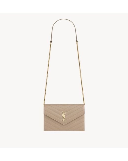 The Cassandre Envelope Chain Wallet in Grain de Poudre Leather is a stylish and practical accessory from the renowned brand Saint Laurent. Made from luxurious leather with a chevron pattern in a poudre exterior colour, this small rectangular wallet features a magnetic closure for security. The crossbody style and metal handle/strap make it perfect for casual occasions, while the leather lining adds a touch of elegance. This sleek and fashionable wallet is a must-have for any woman looking to add a touch of sophistication to her outfit.