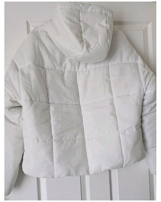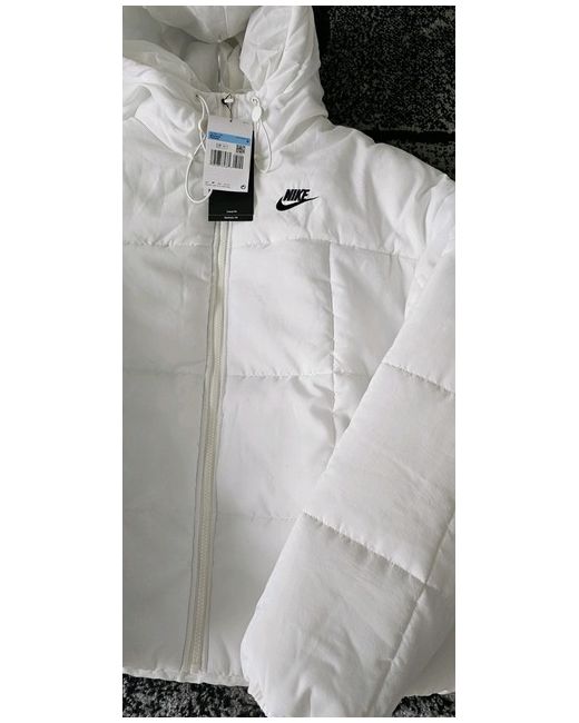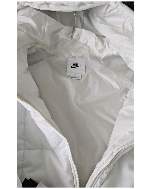 Stay stylish and warm in this Nike Puffer Jacket in white, designed for women in a size medium. Made from polyester with a polyester lining, this mid-length jacket features Nike's signature logo accent. The insulation material is down, making it perfect for the winter season, while the casual style makes it ideal for everyday wear. Machine washable for easy care, this puffer jacket from Nike's therma-fit collection is a must-have for your winter wardrobe.