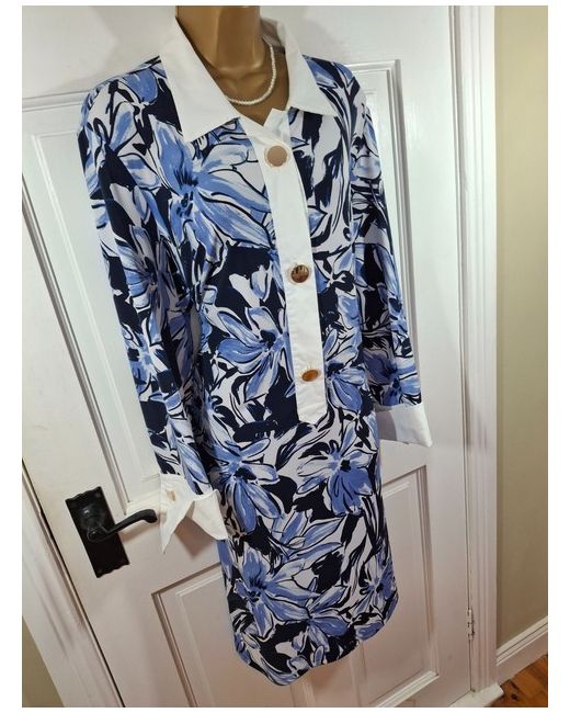 Joseph Ribkoff Blue & White Floral Gold Buttoned Collared Dress. Pinned to mannequin in pictures to show body shape - pretty straight down in reality .