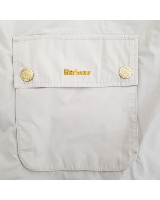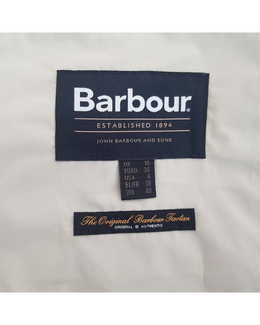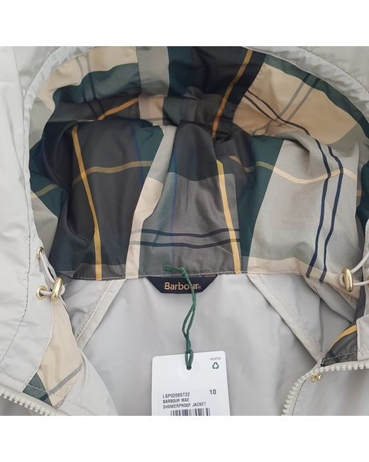 UK10 US6 EU38. Barbour Mae Jacket. Grey rain jacket with check lined hood, drawstring hem and zip closure. Sleeve - 28". Length - 24".