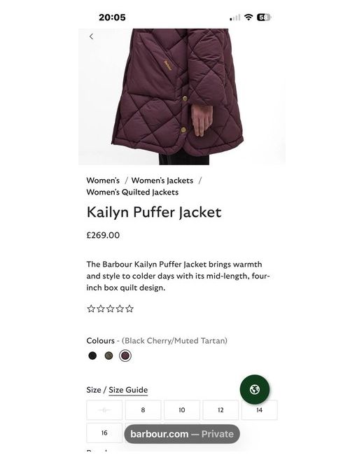 The Barbour Kailyn Puffer Jacket brings warmth and style to colder days with its mid-length, four-inch box quilt design. Size 6 on label but fits 8-10 uk Fits me and I’m a size 10 top. The Barbour Kailyn Puffer Jacket brings warmth and style to colder days with its mid-length, four-inch box quilt design. Featuring a studded placket with a zip fastening beneath, it offers secure closure against the elements. A fitted hood lined in signature Barbour tartan adds heritage flair, while welt-entry patch pockets and studded side vents combine practicality with comfort. Finished with a tartan-lined back buggy for a timeless touch. Colours - (Black Cherry/Muted Tartan) RRP: £269