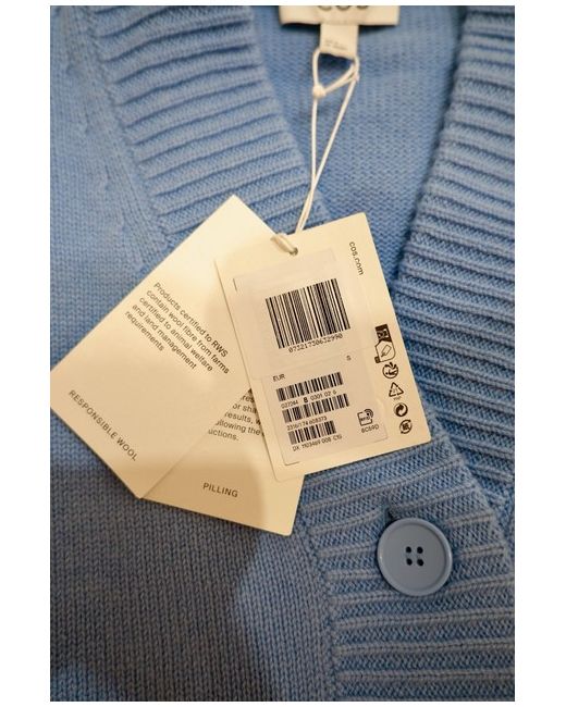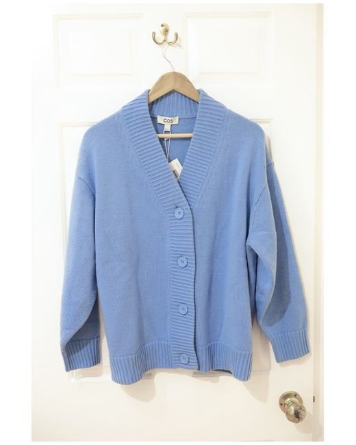 COS v-neck wool cardigan Size S - relaxed fit 100% wool RRP: £95 Ribbed trims Certified according to the Responsible Wool Standard Designed for when the weather starts to cool, this chunky cardigan is knitted from Responsible Wool Standard-certified wool in a fresh sky-blue hue. It"s shaped for an oversized fit that"s enhanced by the dropped shoulders and fastens with a row of tonal buttons. V-Neck Button Fastening Ribbed Hem and Cuffs Composition: 100% Wool Colour: Blue Care: Dry Clean Only