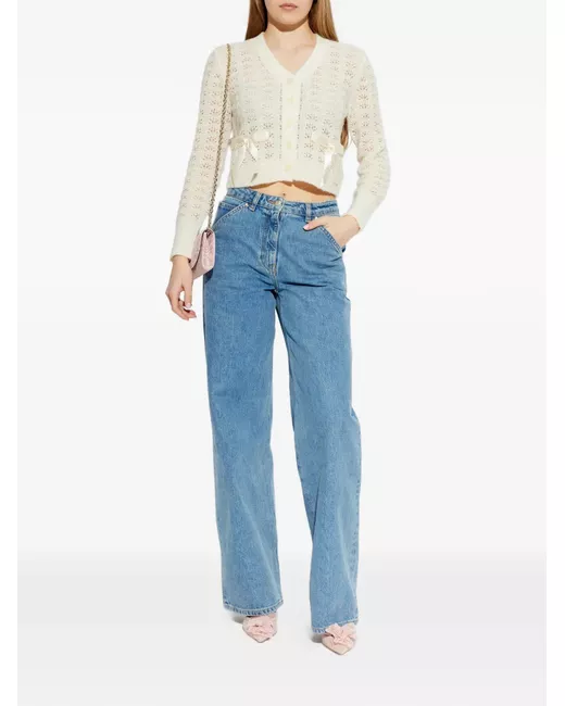 white open-knit design V-neck front button fastening bow detail cropped