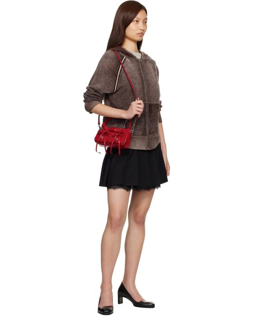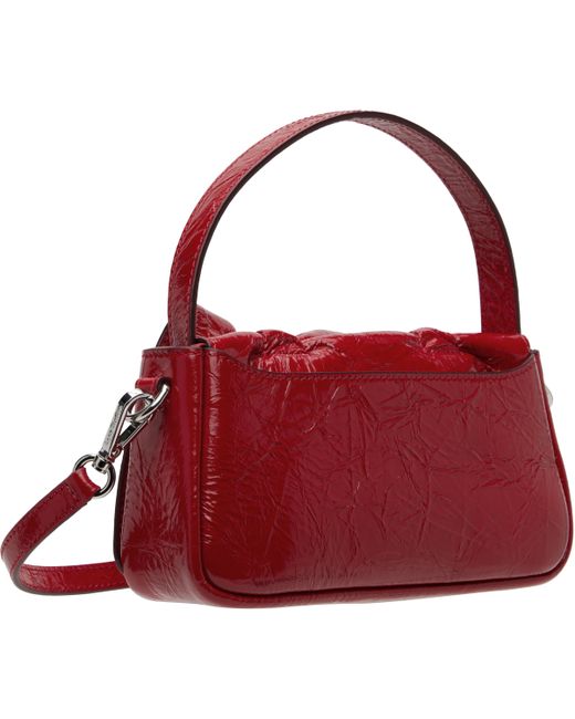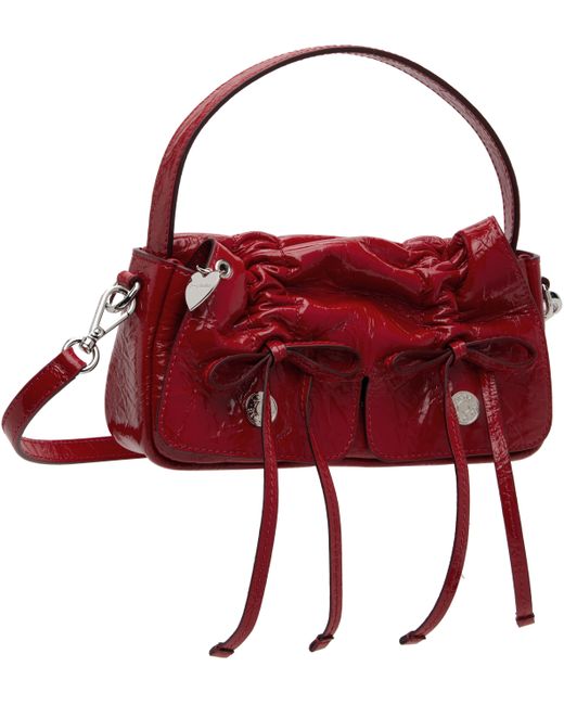 Crinkled patent goatskin top handle bag. · LWG-certified goatskin · Logo embossed at adjustable shoulder strap · Detachable crossbody strap · Logo charm and drawstrings at face · Patch pocket at back face · Magnetic flap · Card slots at interior · H4 x W8.5 x D3 Supplier color: Red