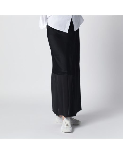 Black skirt by 6397, featuring a patchwork design with mixed fabrics creating glossy and matte areas, a sheer panel at the hem, a slightly A-line fit to the ankle and zip closure.