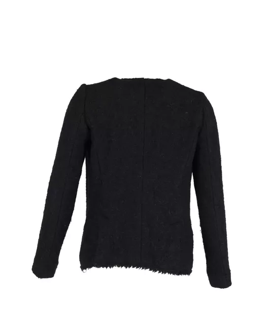 black wool open-front fringed trim long sleeves front pockets Condition: GOOD. This previously owned and used item is in good condition with minimal signs of use. This may include fading of material or plating and scratches.