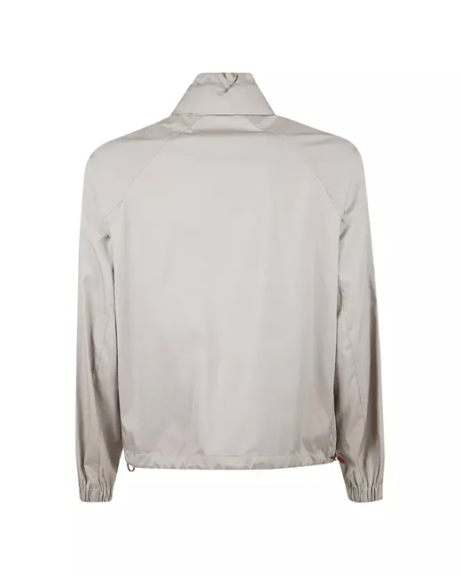 beige stand-up collar flap pockets zip fastening long sleeves elasticated cuffs