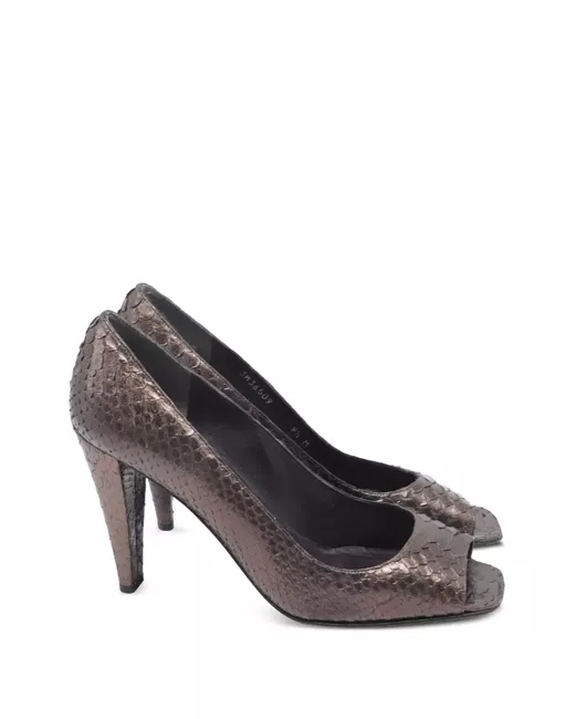 brown leather upper peep-toe snake-effect block heel high heel Condition: GOOD. This previously owned and used item is in good condition with minimal signs of use. This may include fading of material or plating and scratches.