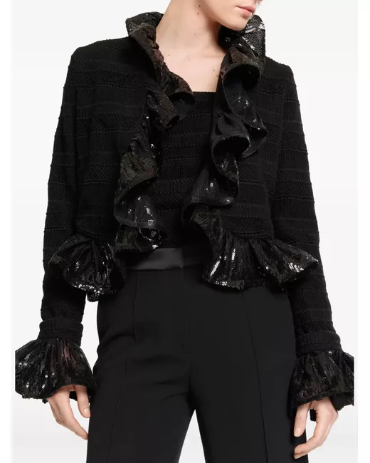 black macramé detailing sequin embellishment ruffled collar ruffled cuffs cropped