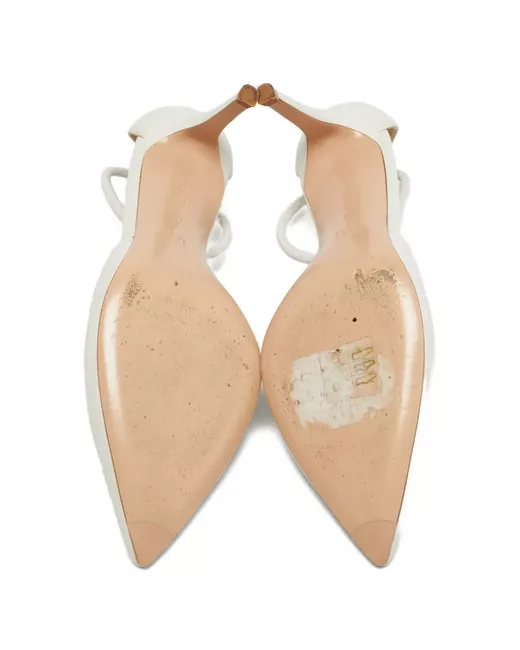 white leather pointed toe stiletto heel ankle strap Condition: GOOD. This previously owned and used item is in good condition with minimal signs of use. This may include fading of material or plating and scratches.