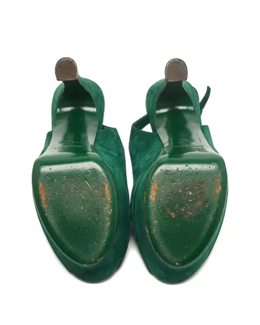 emerald green calf suede peep toe high heel platform sole slingback strap This piece comes complete with a protective dust bag. Condition: GOOD. This previously owned and used item is in good condition with minimal signs of use. This may include fading of material or plating and scratches.
