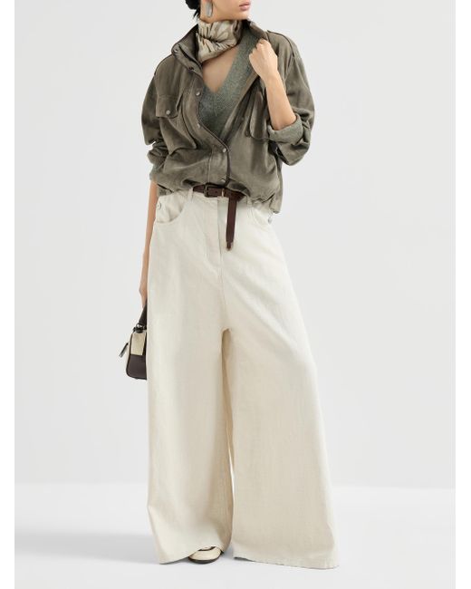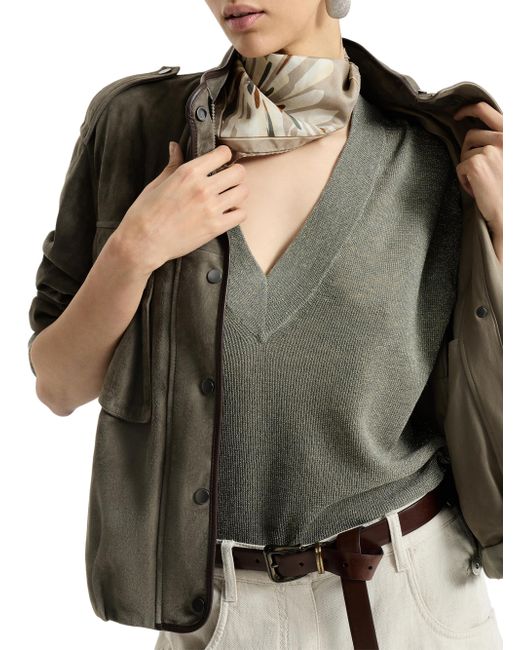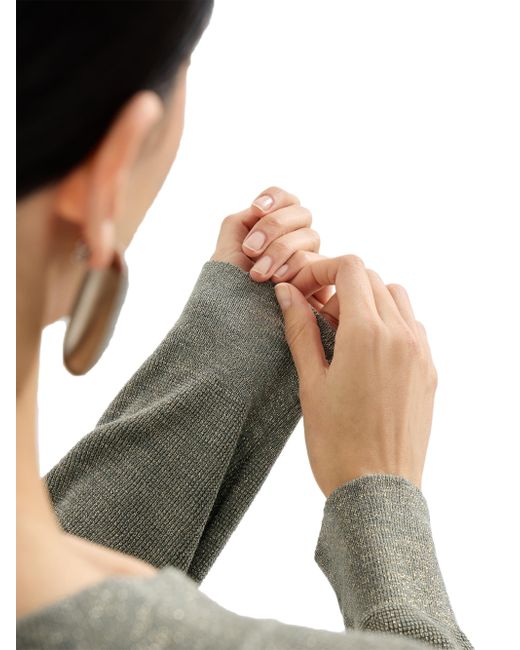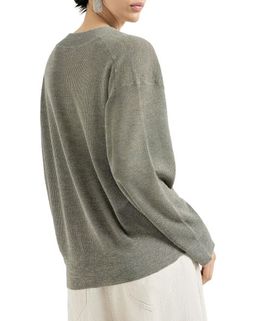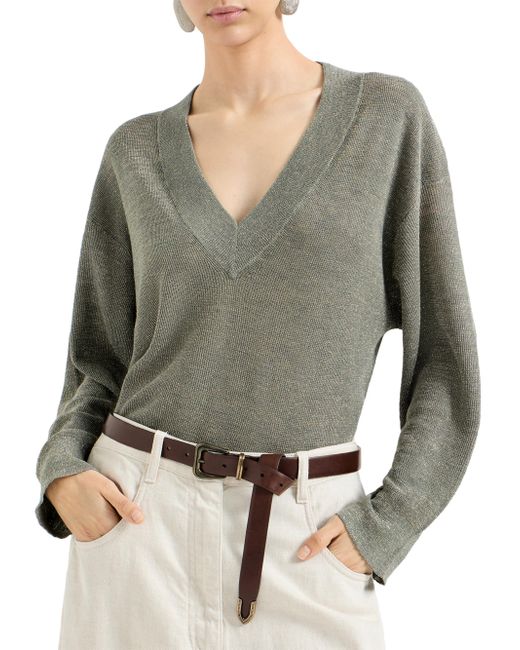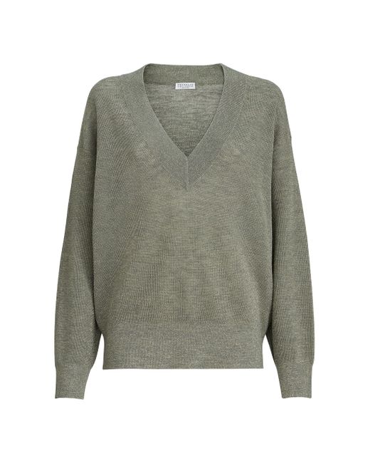 Sparkling linen sweater. Rib knit V-neck Drop shoulder Raw edge effect at cuffs and bottom English rib Hand wash only, do not bleach. Dry garment on a horizontal surface, do not tumble dry. Iron at low temperature. Alternatively, delicately dry clean garment 45% linen, 37% polyester, 10% metal, 8% nylon Made in Italy. Lsd Rtw - Brunello Cucinelli Rtw > Brunello Cucinelli > Saks Fifth Avenue. Brunello Cucinelli. Color: Green. Size: Medium.