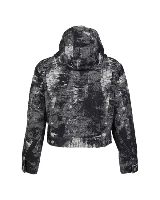 dark blue abstract pattern drawstring hood zip fastening chest pockets buttoned cuffs