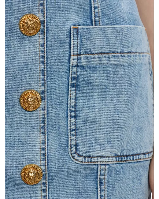 denim blue button embellishment square neck two front pockets zip fastening sleeveless