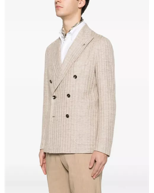 beige double-breasted button fastening long sleeves peak lapels chest welt pocket two front pockets