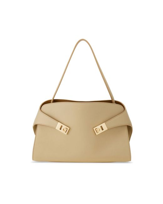 beige calf leather top zip fastening detachable shoulder strap logo stamp to the front Gancini flip-lock fastening gold-tone hardware partitioned compartment internal zip-fastening pocket internal card slots internal logo stamp
