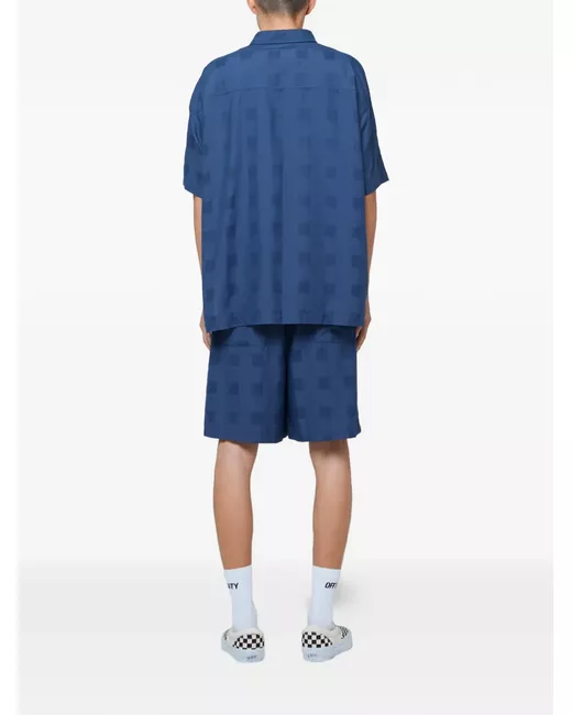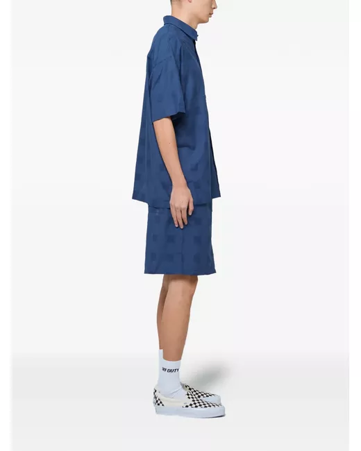 navy blue check pattern short sleeves button fastening classic collar tonal stitching