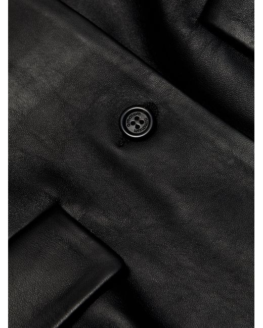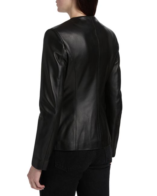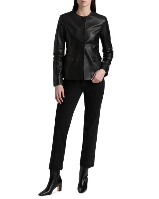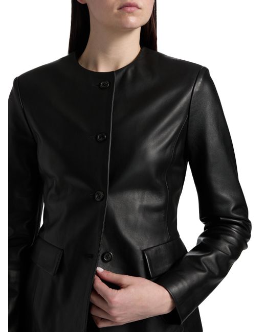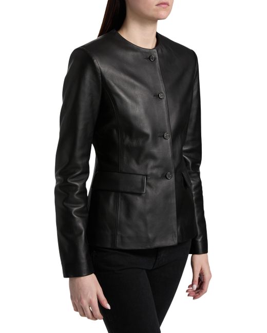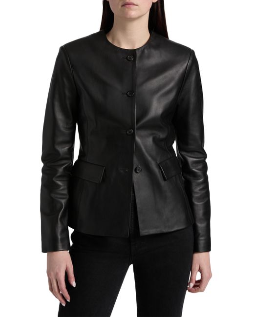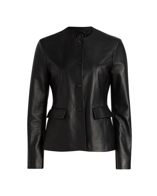 Crafted of Italian Nappa leather, Armarium's Ramonda jacket features a collarless design, flap pockets, and a button-front closure. Round neck Long sleeves Front flap pockets Button-front closure 100% leather Lining: 100% cupro Dry clean by leather professional Made in Italy SIZE & FIT About 24" from shoulder to hem Model measurements: 5'10" tall Model is wearing a US size 4. Advanced European - Italian Collections > Armarium > Saks Fifth Avenue. Armarium. Color: Black. Size: 2.