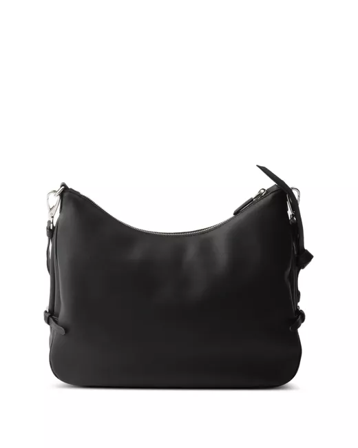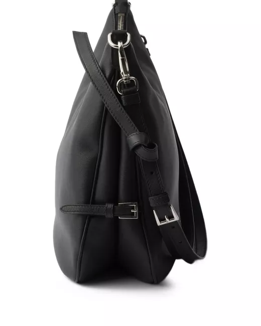 black adjustable shoulder strap embossed lettering logo zip closure metal hardware two internal pockets
