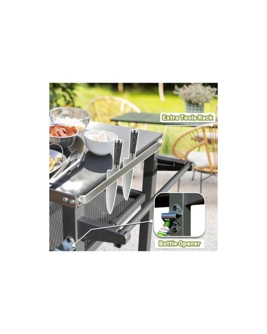 Rust-Proof Stainless Steel Countertop Bbq Cart: Designed for durability and ease of maintenance, this food prep table resists rust. The mesh partition prevents dust and water build-up, simplifying cleaning. Extra tool hooks keep your grilling essentials organized and within reach.