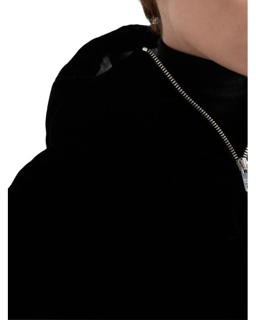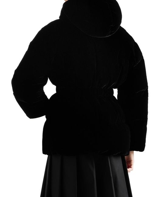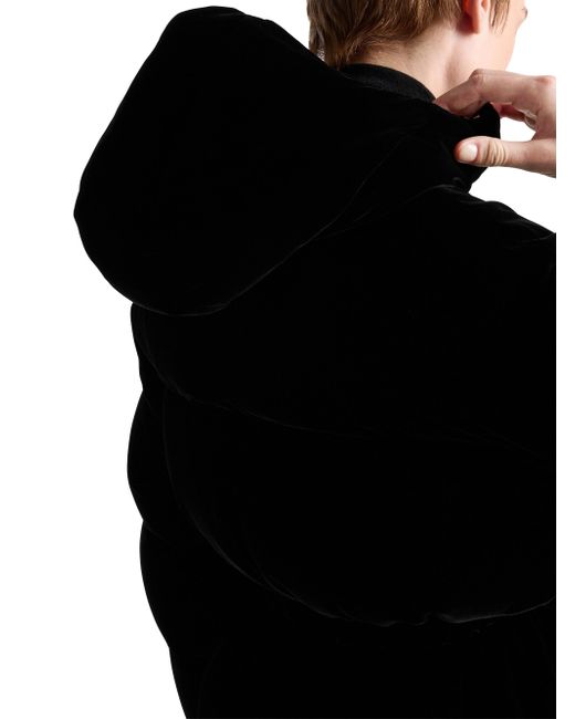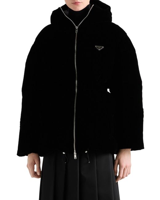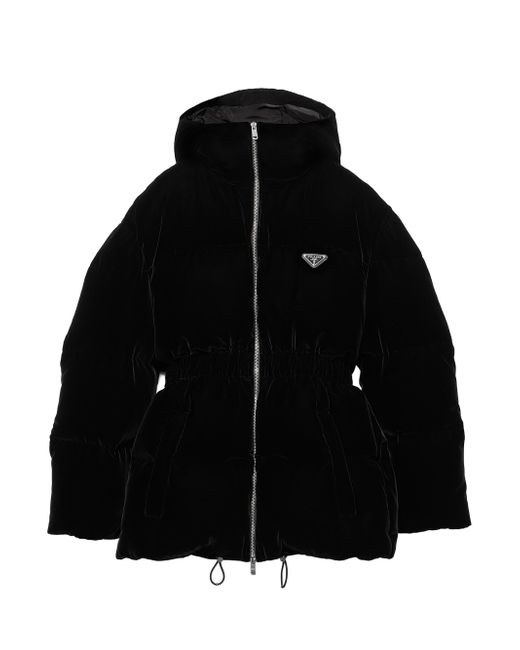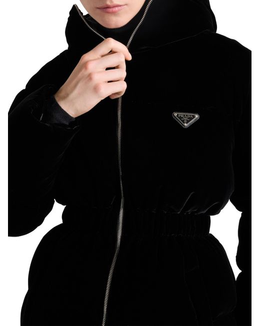 Velvet down jacket. Regular fit Goose down padding Hood Long sleeves Straight cuff Zipper closure Welt zipper pockets Elasticized drawstring on the hem and hood Enameled metal triangle logo Elasticized waist 70% viscose, 30% cupro Imported. Lsd Rtw - Prada Rtw > Prada > Saks Fifth Avenue. Prada. Color: Black. Size: 0.
