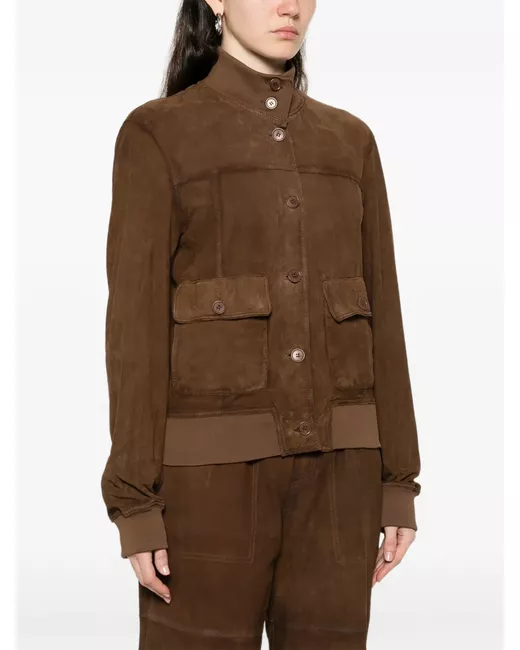 brown stand-up collar button fastening patch pockets long sleeves ribbed cuffs ribbed hem