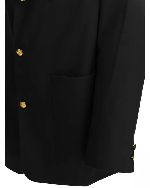 dark blue button fastening front patch pockets chest welt pocket buttoned cuffs notched lapels