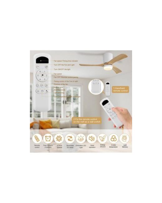 42-inch ceiling fan with light, featuring a dimmable lighting system with three color temperature settings to effortlessly adapt to any ambiance. Equipped with a premium reversible Dc motor for quiet, smooth operation—delivering cool breezes in summer and circulating air in winter for year-round use. Remote control offers one-touch access to 6 fan speeds, 3 light colors and brightness levels, plus forward/reverse rotation and 1/4/8-hour timer functions for hassle-free operation. Installation is straightforward with included instructions and video tutorials. Suitable for indoor spaces like living rooms, bedrooms, and offices, it also seamlessly fits covered outdoor areas such as patios and porches. The brand guarantees durability and performance, with after-sales support always available.