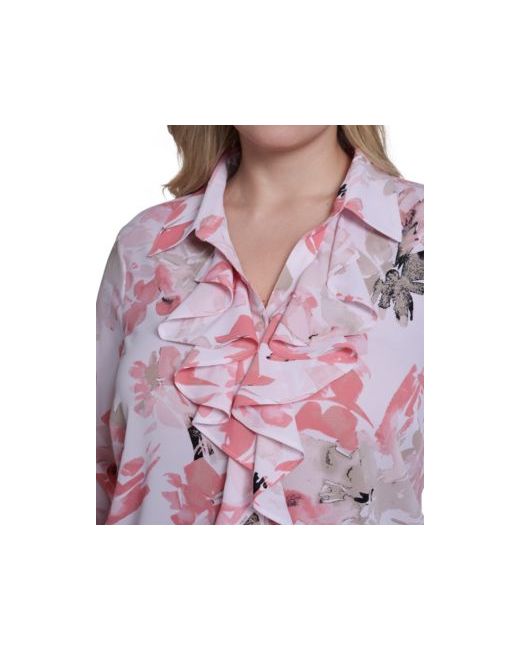 Romantic detail elevates this Calvin Klein long-sleeve blouse, showcasing a printed pattern with delicate ruffle-front accents. A collared neckline and button-front design refine the look.