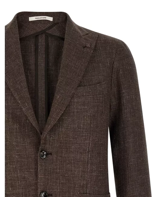 brown front button closure peak lapels removable metal pin breast pocket patch pockets