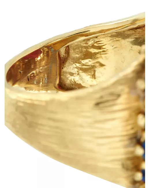 18kt yellow gold 0.64 ct diamonds 16.0 ct ruby cabochon 5.0 ct sapphires Normal everyday use and external agents may reduce the lustre of gemstones and gold surfaces. To maintain, use specific, non-abrasive products specially meant for cleaning jewellery. Condition: EXCELLENT. This previously owned item is in near-perfect condition with no signs of damage or use.