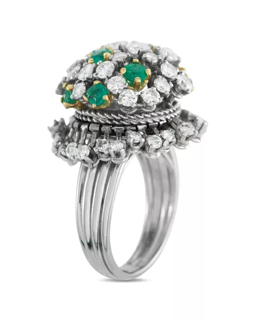 platinum diamond emerald 2.50ct diamond 1.10ct emerald dome design Normal everyday use and external agents may reduce the lustre of gemstones and gold surfaces. To maintain, use specific, non-abrasive products specially meant for cleaning jewellery. Condition: EXCELLENT. This previously owned item is in near-perfect condition with no signs of damage or use.