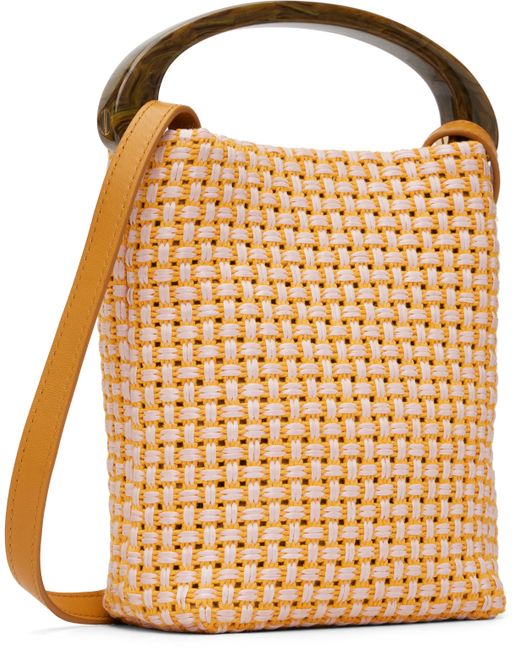 Basket-woven cotton-blend top handle bag. · Fixed resin top handle · Adjustable and detachable crossbody strap · Magnetic closure · Patch pocket at interior · Buffed leather lining · H7.5” x W5.5” x D3” Supplier color: Ocra
