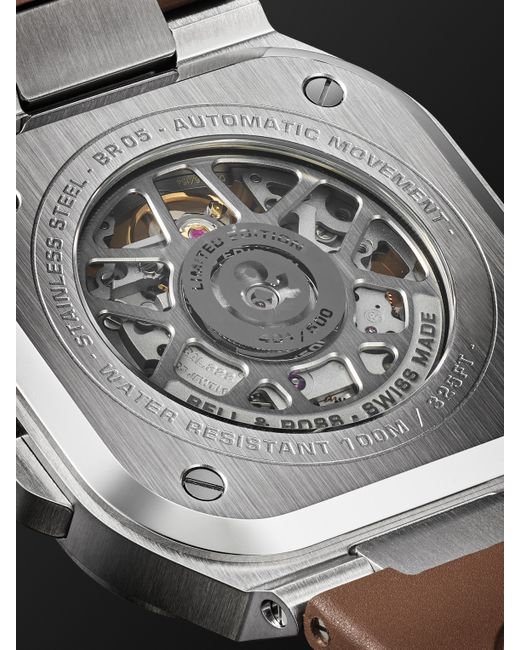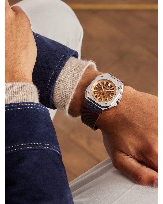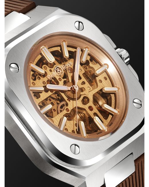 With Bell & Ross's limited-edition 'BR 05' timepiece, you're able to marvel at the inner workings of its calibre BR-CAL.322. automatic movement in a mere glance thanks to the impressive skeletonised dial – the striking golden-brown hue is thanks to the tinted panel and galvanised golden flange. It's encased in stainless steel that's polished for a sleek satin finish and has Super-LumiNova®-filled hands and indices for maximum legibility. For warranty information, please refer to details & care
