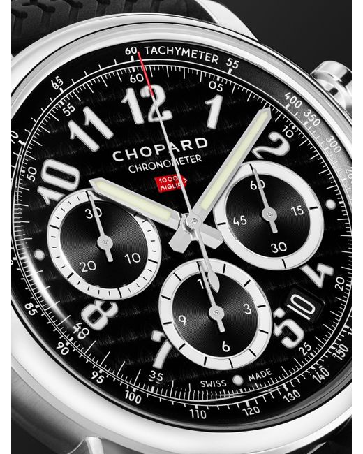 Chopard is the official timing partner and principal sponsor of the legendary Italian 'Mille Miglia' race, and its watches of the same name combine the efficiency of automotive engineering with the excellence of fine watchmaking. This latest timepiece takes the form of a 40.5mm automatic chronograph with bezels, crowns and pushers made from ultra-tough Lucent SteelTM. The black galvanised dial houses a trio of counters and tachymeter scale, while the rubber strap is modelled on racing tyres. For warranty information, please refer to details & care
