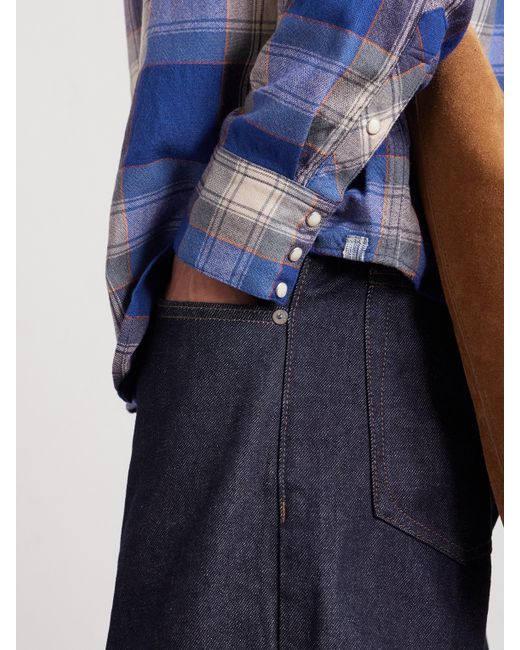 visvim's 'Four Corners' shirt is your quintessential sawtooth, with its pearlescent snaps and angled yokes. It's been made in Japan from a tactile wool and linen-blend and woven with blue and grey checks that are set on the diagonal at the pockets.