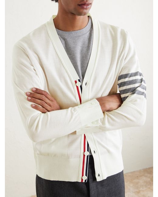 Stateside label Thom Browne is lauded for preppy staples, like this cardigan. Knitted in Italy from fine wool, it has the label's signature striped sleeve and a semi-fitted shape. Leave the top and bottom buttons undone to show off the tricolour trim.