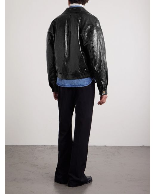 Versace's jacket is cut from tactile python-effect leather that ripples and sheens under different light. Made in Italy, it's shaped like a classic blouson, with a squared collar and ribbed waistband. Leave it unzipped to see flashes of the 'Barocco' lining.